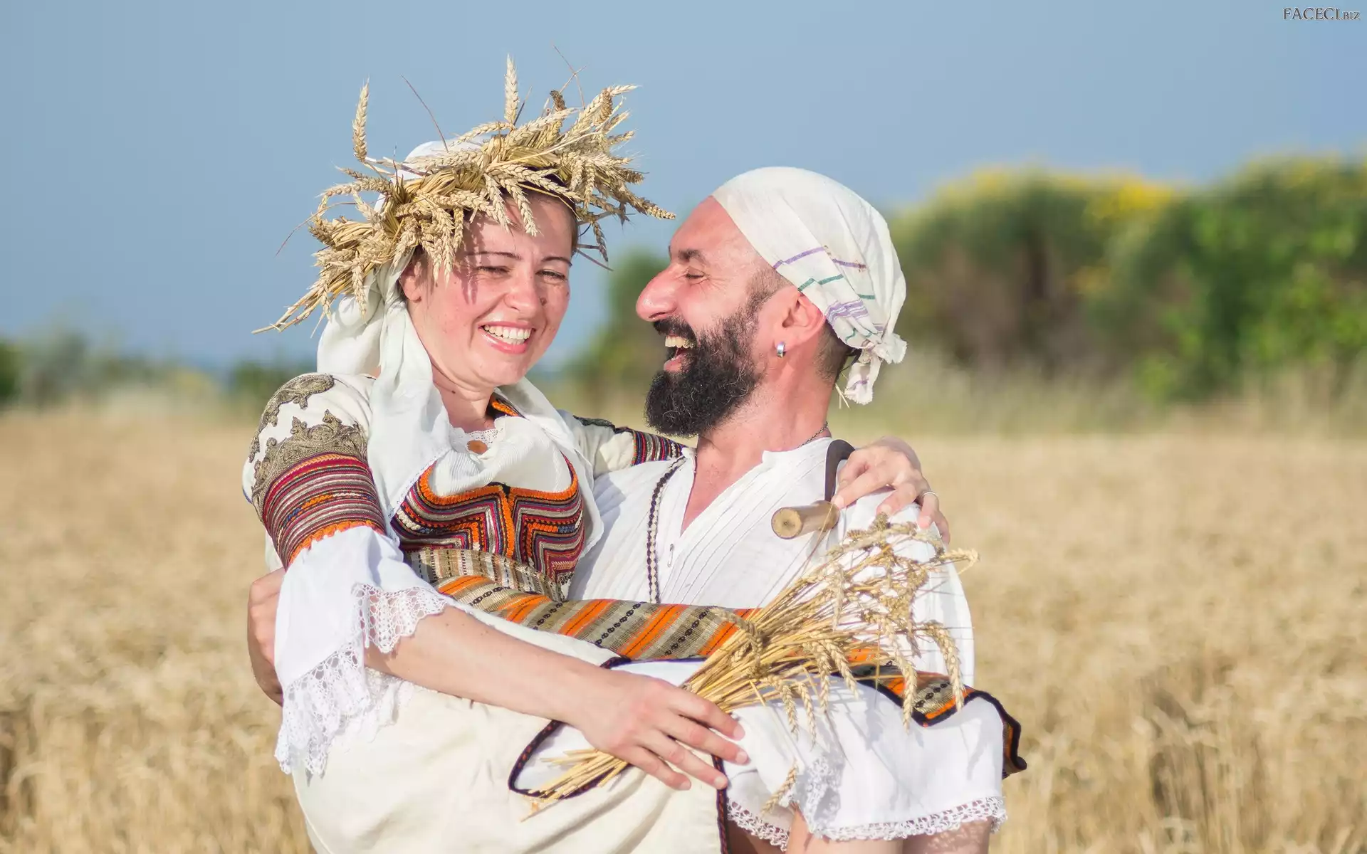 Stroje ludowe, Pszenica, Mężczyzna, Żniwa, Wianek, Pole, Kobieta, Śmiech - faceci.biz